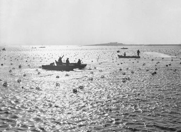 1970年代,青岛西部青岛市第一海水养殖厂养殖区海带施肥作业,工人正用喷枪向海面喷洒肥料。