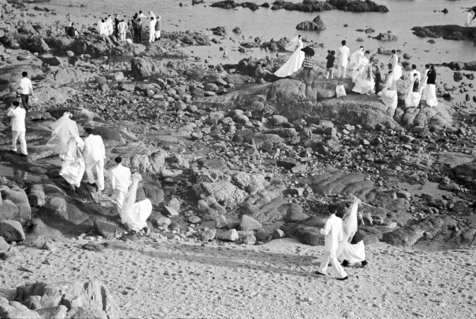 1990年代,青岛海边礁石滩上多位新人拍摄婚纱照。彼时,青岛海岸线已成为热门婚纱照拍摄地。