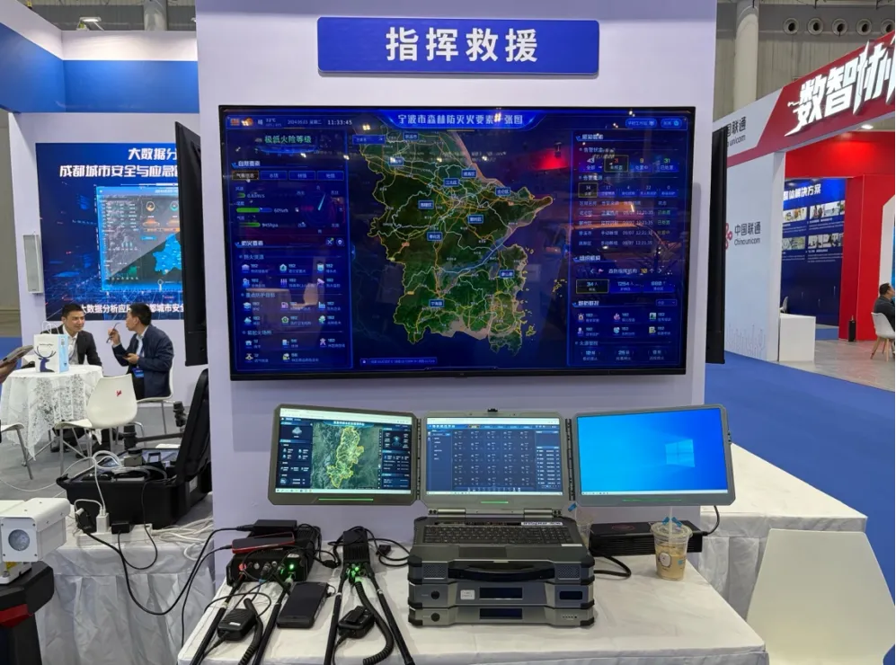 踏入浪潮集团的展区,一面数字大屏与一台便携式的三联屏指挥系统格外引人注目。这不仅是数字应急救援的“智慧大脑”,更是现场指挥的“神经中枢”。