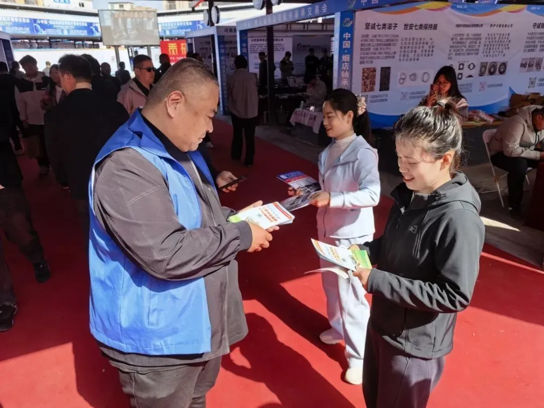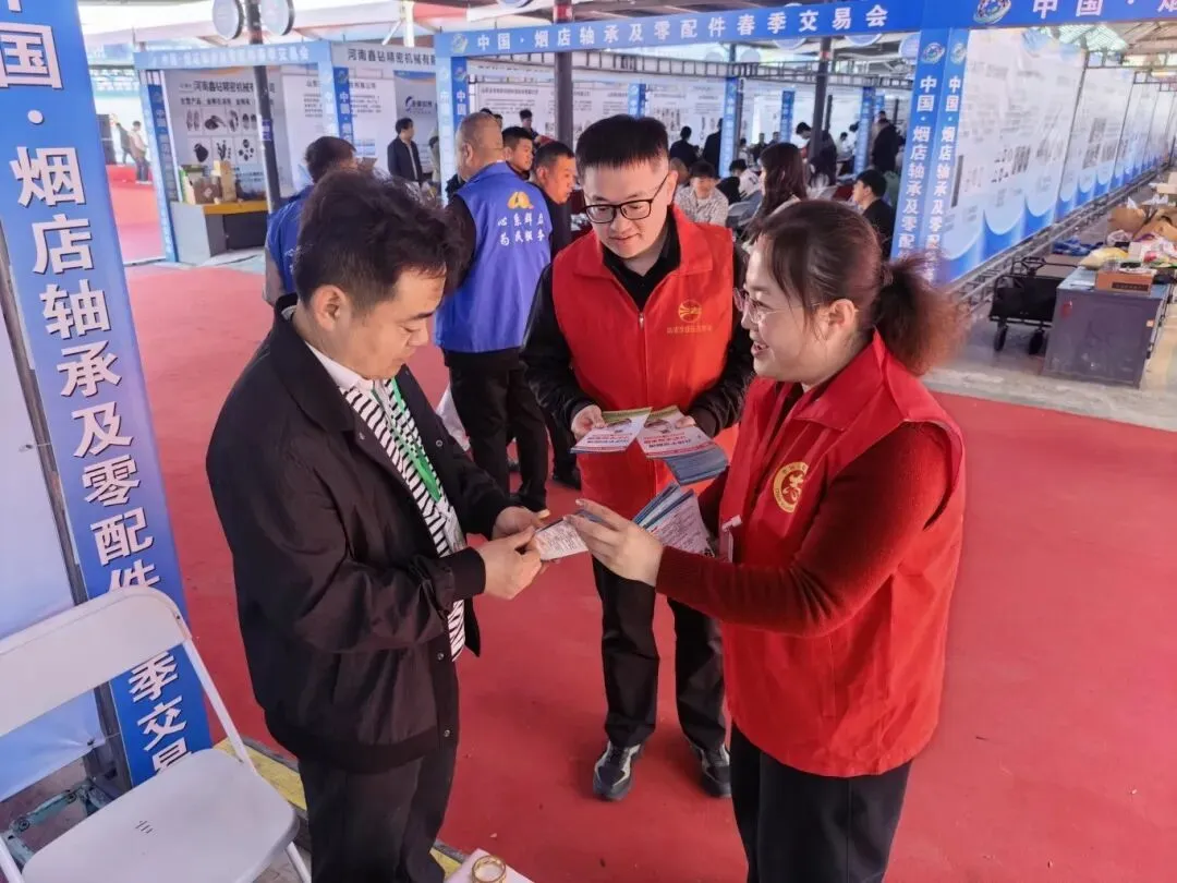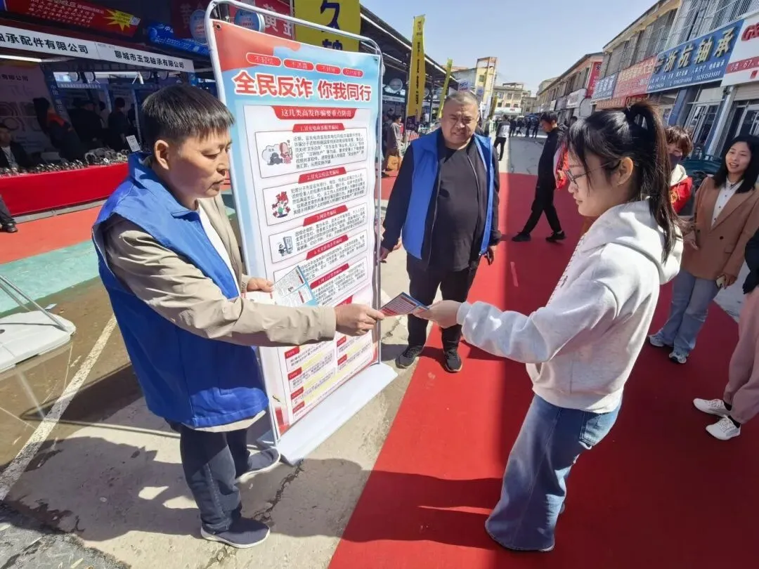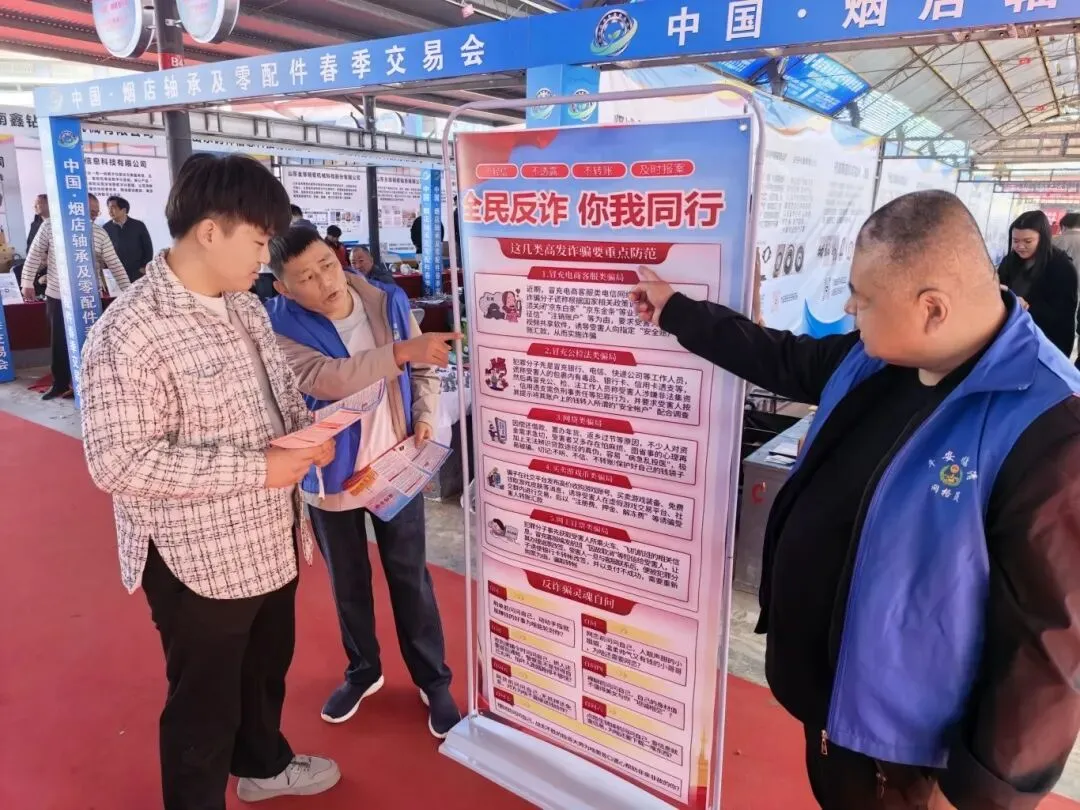 春风送暖,商机涌动。在中国(烟店)轴承及零配件春季交易会现场,烟店镇平安法治办公室联合镇司法所在密集的展位与门市之间设立普法流动宣传点,同时主动走进市场周边门市,将反诈普法与展会经济深度融合,让客商在洽谈合作的同时,筑牢资金安全防线。