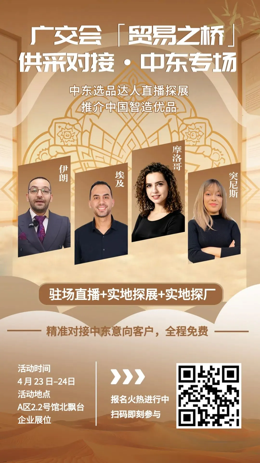 形式:邀请伊朗、埃及、摩洛哥的5位主播,以“采购商”身份深入展位,与企业代表面对面交流,体验产品,录制探展短视频(约10-15分钟),并发布于其个人社媒账号,附带企业展位号及联系方式。