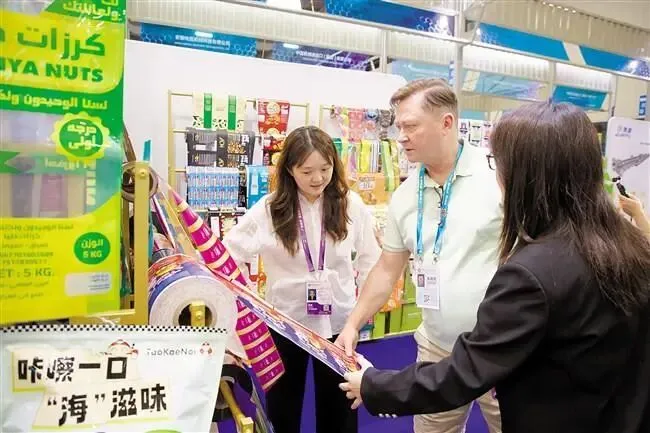 同样把“定制”挂在嘴边的还有广东兆天亿包装材料有限公司。展位上摆满了印着不同国家文字、不同图案的食品包装卷膜,外贸经理谢明扬指着其中几款说:“这是也门客户定制的薯片充气包装,还有番茄酱包装,很多国家的客户我们都生产过。”除了食品包装,他们带来的一款物流缓冲气柱袋也吸引了不少客商驻足。“原材料跟气阀都是自己生产的,比较有竞争力。它不像气泡膜那么占地方,要用的时候再把气充起来,缓冲效果还好。”谢明扬认为,这种兼顾成本与实效的设计,恰好打中了跨境物流的痛点。