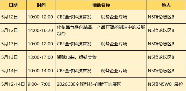 15+智造科技系列活动,将围绕气雾剂装备及产品智能制造、智能制造生产经验分享,智能包装应用、绿色包装技术升级与AI智造落地等主题展开,并在2026CBE全球科技-创新工坊展区现场演示产品生产流程。