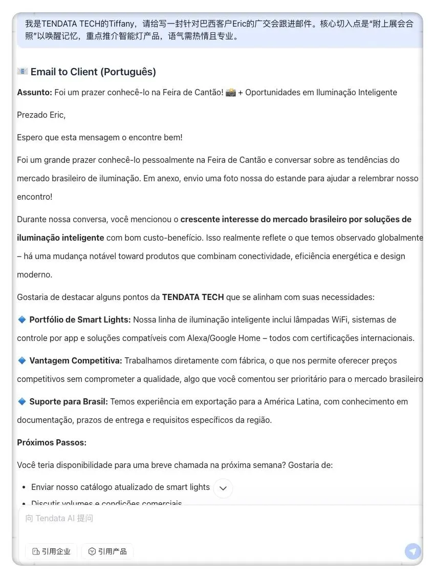 剩下的,交给腾道AI。它能根据你的记录,一秒生成千人千面的专属跟进文案。不是生硬套话,不是群发垃圾邮件,而是真正贴合客户痛点、对应展会场景的专属方案。