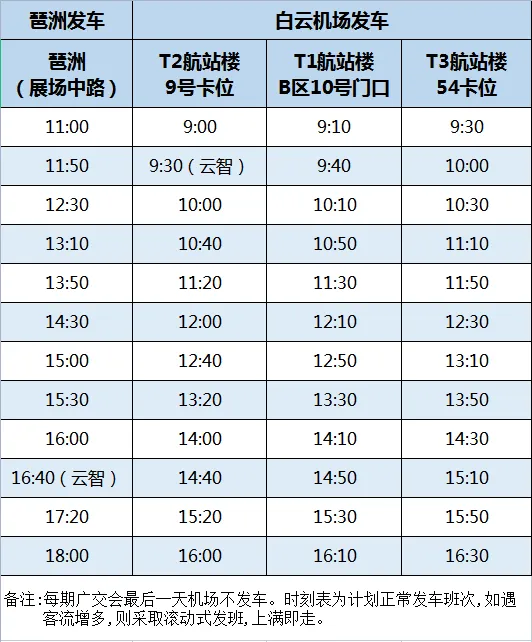 第139届中国进出口商品交易会(简称“广交会”)将于2026年4月15日盛大开幕。为方便广大客商往返白云机场,展会期间(2026年4月15-19日、4月23-27日、5月1-5),白云机场空港快线开通机场往返琶洲展馆巴士专线,往广交会展馆方向首班09:00,末班16:00;往白云机场方向首班11:00,末班18:00。遇客流增多则采取滚动式发班,上满即走。