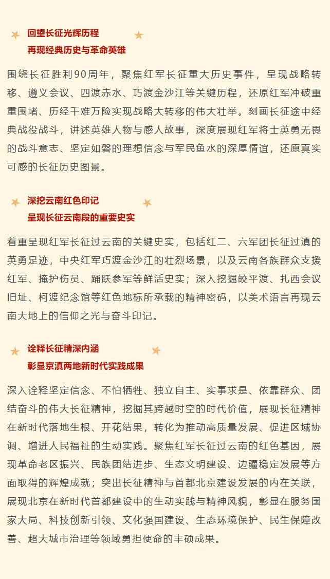 新时代首都美术展是北京市文联、北京美协的一项重要主题性美术创作展览活动,自2022年立项,取得了很好的业界评价和积极的社会反响。在即将迎来纪念红军长征胜利90周年的重要时刻,北京市文联将携手云南省文联,北京美协联动云南省美协共同举办2026年新时代首都美术展,以“金沙水拍云崖暖”为主题,以艺术形式回望长征光辉历程,弘扬伟大长征精神,聚焦长征云南段重要节点,展现新时代京滇两地在长征精神激励下的建设成就与精神风貌。
