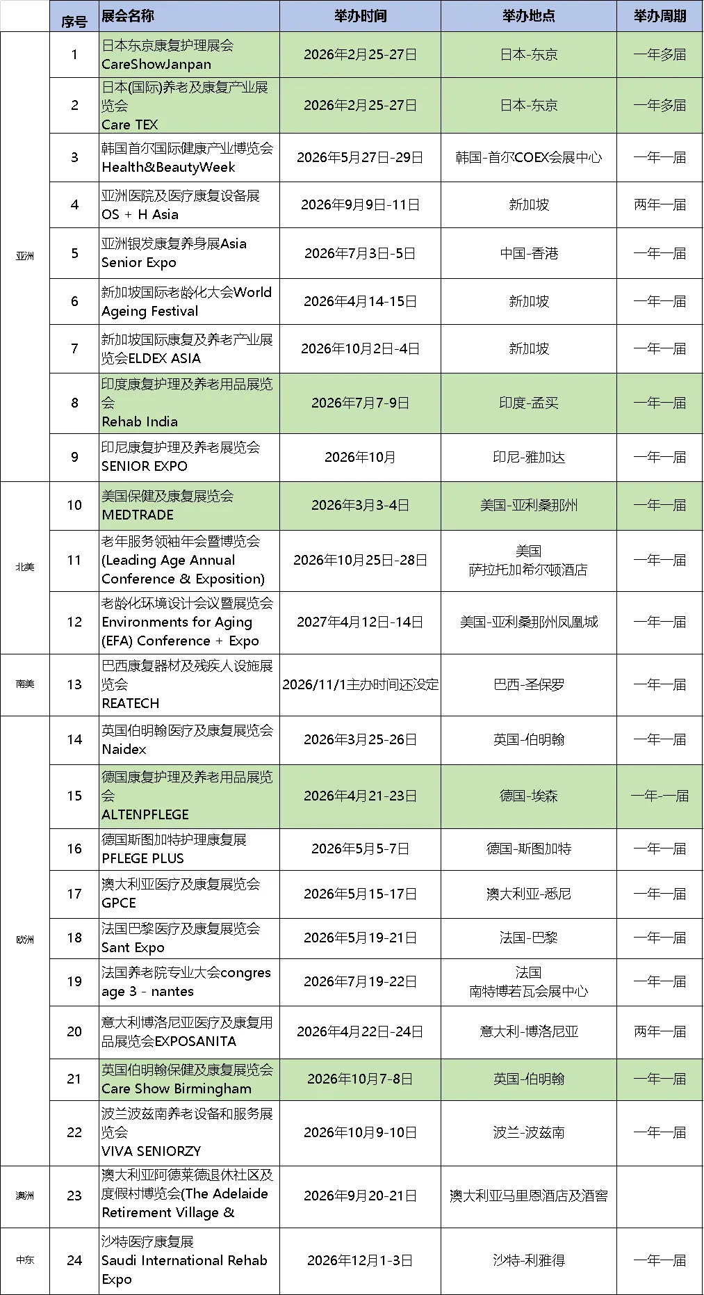 2026年全球养老康复展会计划表