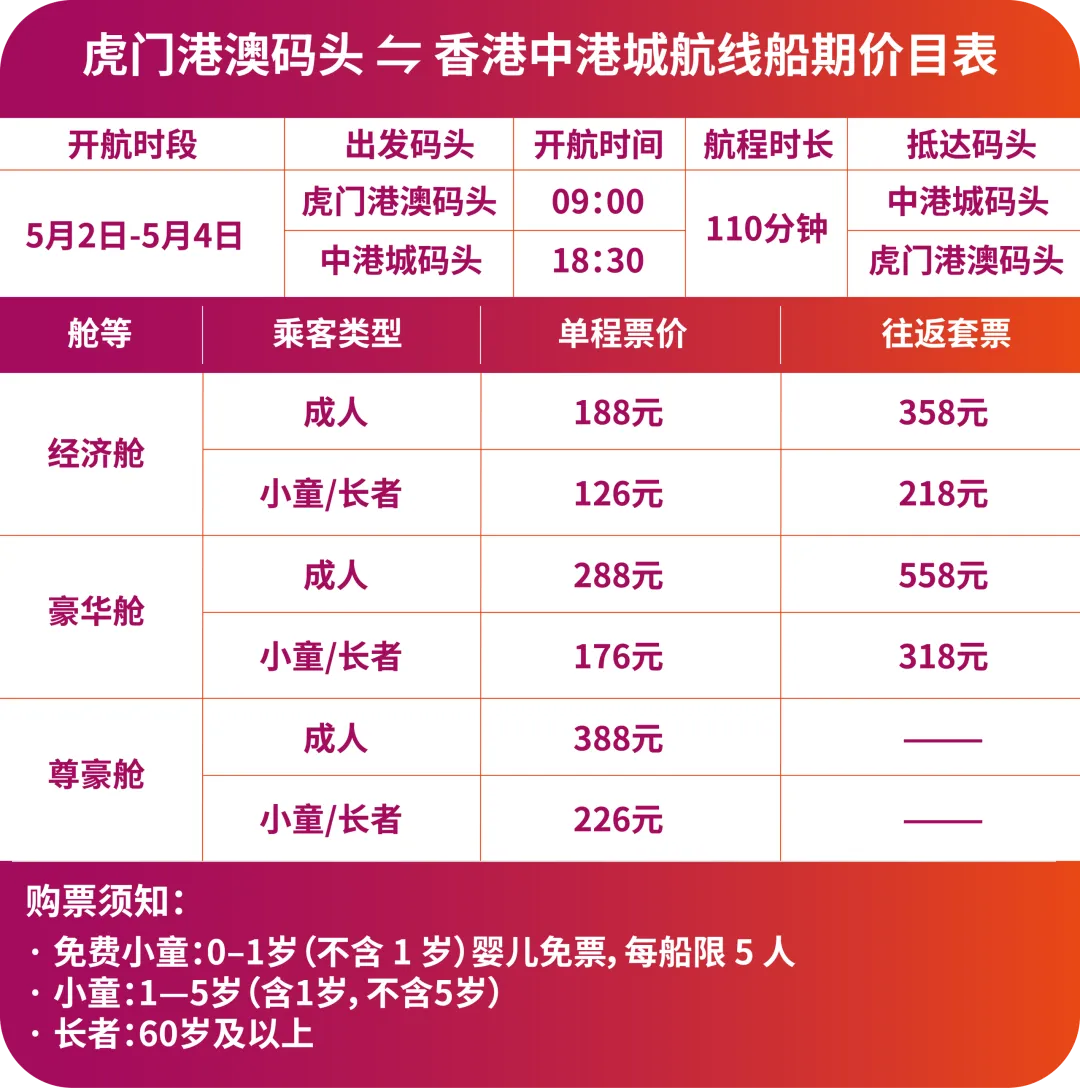 ⭐增开虎门港澳码头 ↔ 香港中港城航线,详细船期价目如下: