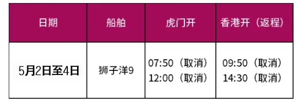 另,2026年5月2日至4日取消虎门往返机场航线航班,2026年5月5日机场航线恢复原计划航班,具体安排如下: