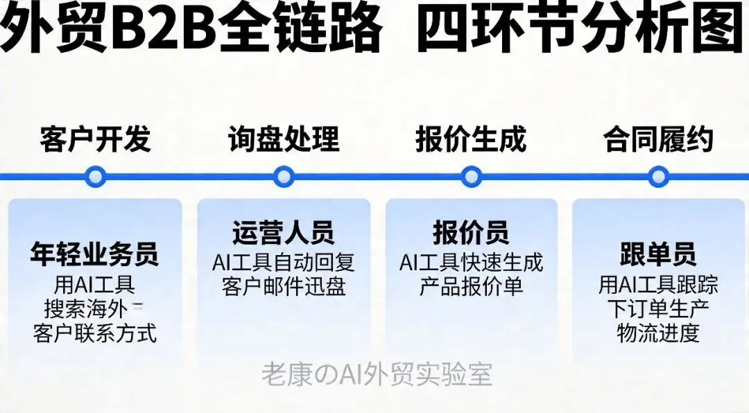 两年前AI工具还比较初级,写出来的邮件生硬、翻译不准、分析不深。现在不一样了。以DeepSeek为代表的大模型,在B2B场景的理解能力大幅提升,能处理复杂的商务场景。早期外贸人看AI,觉得是噱头。现在不一样了。订单难拿、成本上涨、客户要求提高,不用AI真的扛不住。以前要用AI,还得学编程、调API。现在不用了,直接网页端、APP就能用,效果还更好。二、全链路分析:AI如何重塑外贸B2B四大环节