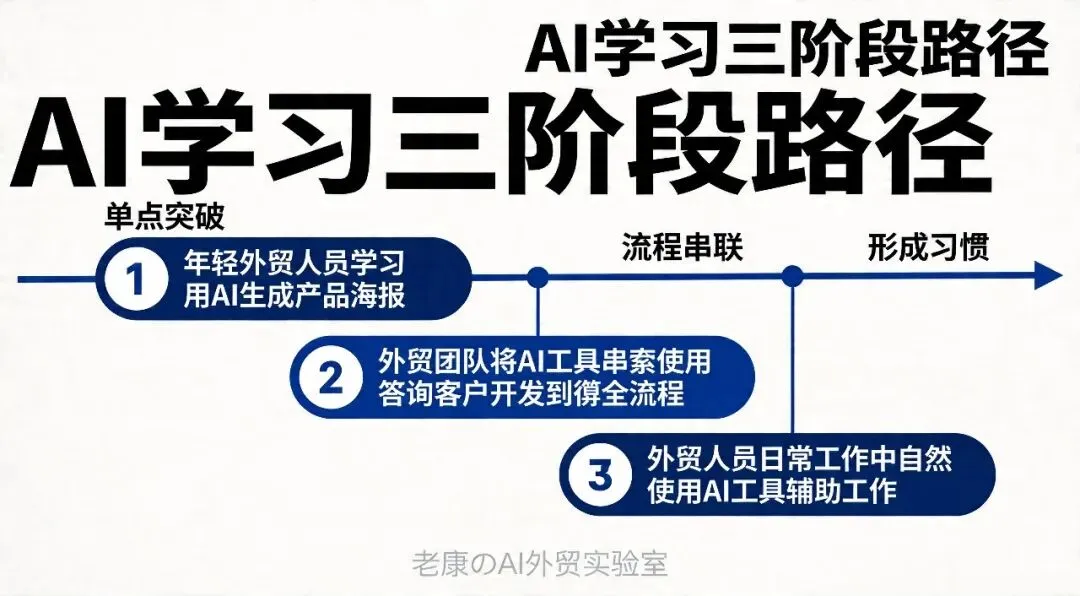 别追求大而全的AI系统,先解决一个痛点。比如你开发信回复率低,就专攻AI写邮件的工具。等这个痛点解决了,再解决下一个。再好的工具不能用也白搭。选工具要选自己学得会、用得起的。有些工具功能强大但价格昂贵,中小企业不一定承受得起。AI工具用久了会越来越懂你。比如AI写开发信,用多了它就知道你的产品特点、客户类型、沟通风格。选有学习能力的工具,长期价值更大。3.3 学习路径:从最小可行开始