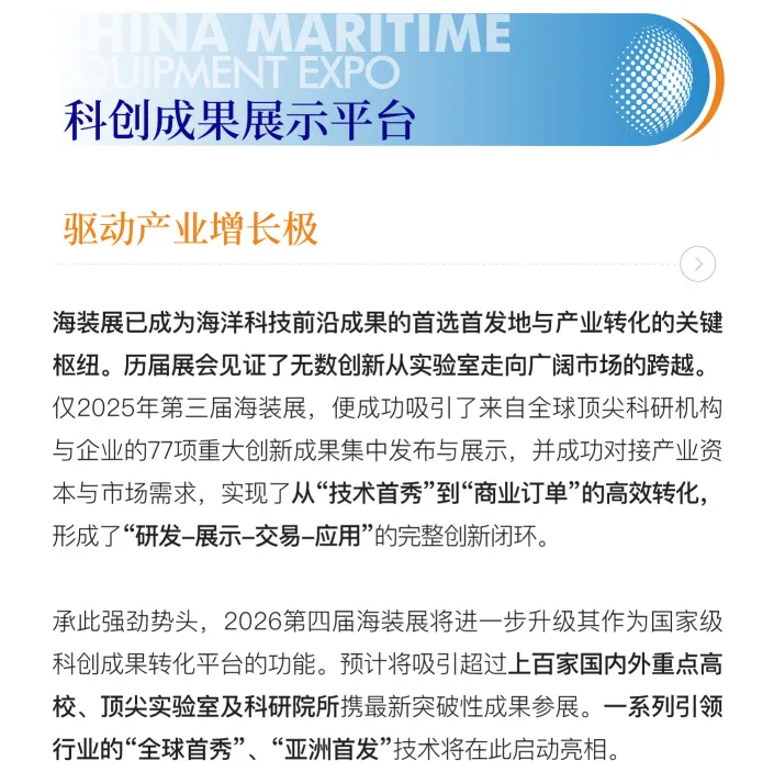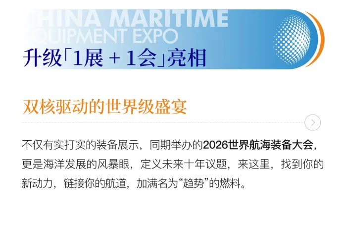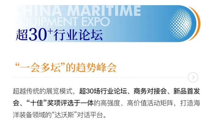 作为海洋装备产业领域重要的会展品牌,中国海洋装备博览会已于 2023年、2024年、2025年连续成功举办三届。已成为立足国内、面向国际的“海洋装备”产业领域,集“产业链合作、产学研合作、经贸对接、科技创新、科普体验”等为一体的专业化交流合作平台。为积极发挥行业风向标引领作用,搭建“专业化、规模化、国际化”的交流合作平台,持续打造行业一流的专业会展品牌;积极吸引全球要素资源,推动该领域国内国际双循环相互促进,助力海洋装备产业高质量发展。2026 年10月16日至19日在福建福州市将继续举办“2026第四届中国海洋装备博览会”,同期还将举办2026第四届世界航海装备大会。