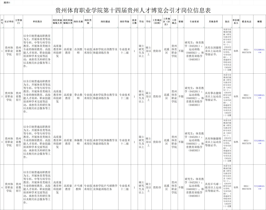 面向社会公开引才4名,具体岗位及要求见《贵州体育职业学院第十四届人才博览会引才岗位信息表》(见文末附件1)。