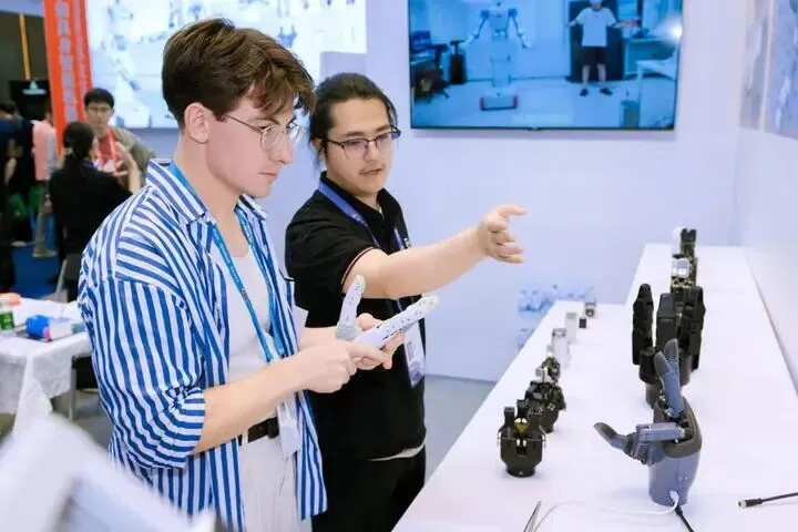 在知行机器人的展位上,人形机器人“撼岳”一出场就引起了“围观”。这款全身搭载20余个高精度驱动关节的机器人,既能扛起30公斤重物完成物流搬运,也能以亚毫米级精度执行零件装配、螺丝旋拧等精细操作。“从工厂的柔性生产、实验室的试剂处理,到商场的货物上架、园区的安防巡检,我都能胜任。”“撼岳”一边“自我介绍”,一边灵活地挥手致意,逗笑了不少围观客商,现场气氛轻松热烈,大家都抢着和它“交朋友”。