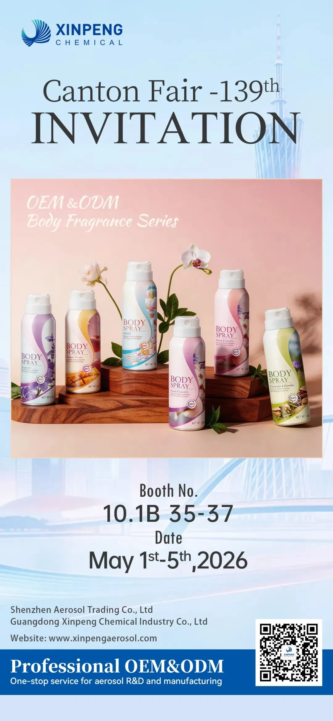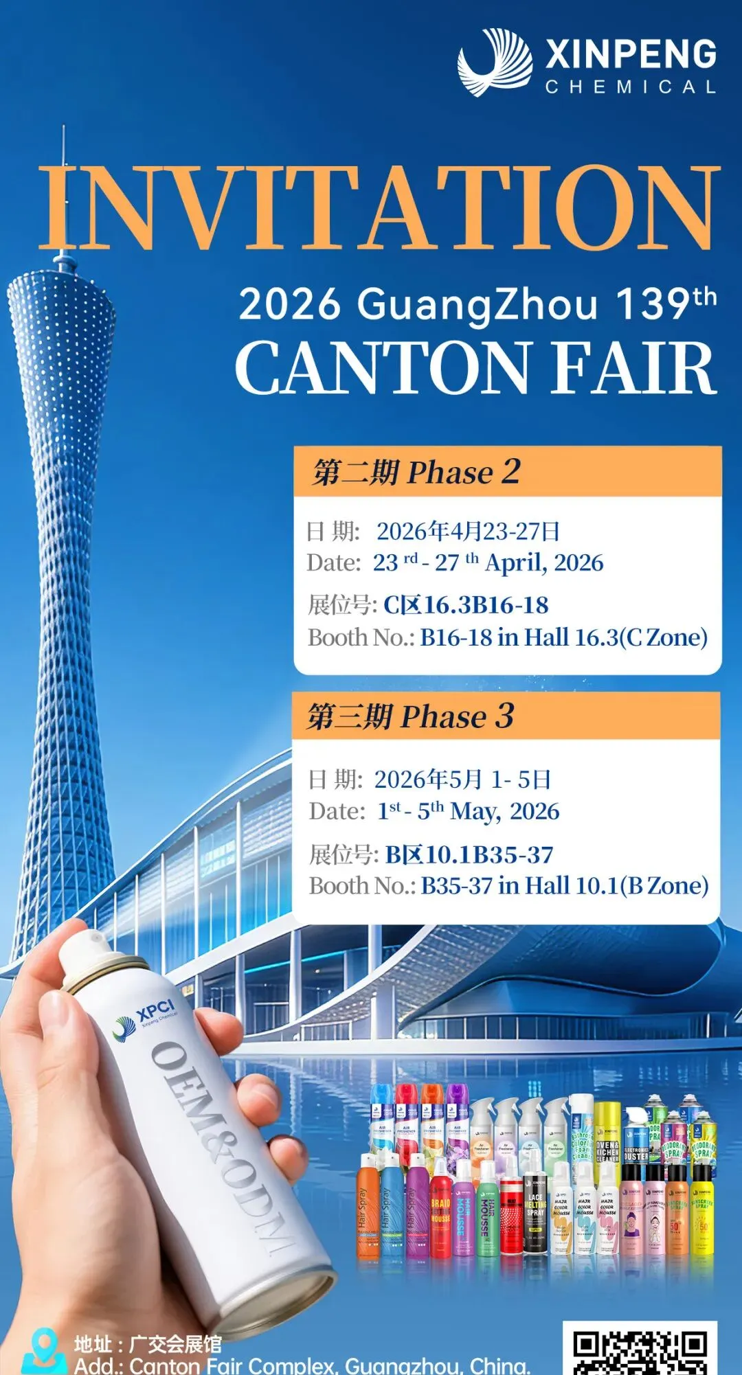 The 139th China Import and Export Fair (Canton Fair) is now grandly open. Xinpeng Chemical, with a full range of aerosol products and one-stop OEM/ODM solutions, will proudly participate in Phase 2 and Phase 3, focusing on household products, personal care, and healthy consumption. We welcome global buyers to explore business opportunities and seek win-win cooperation.