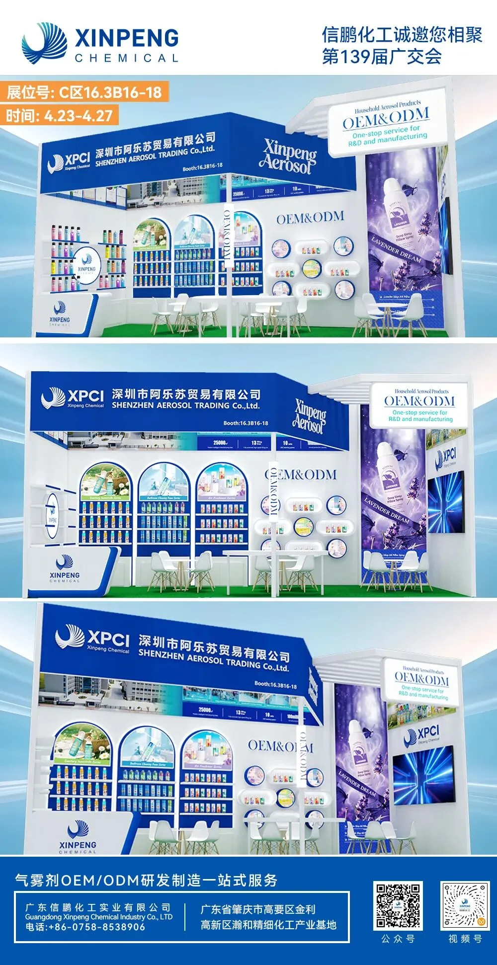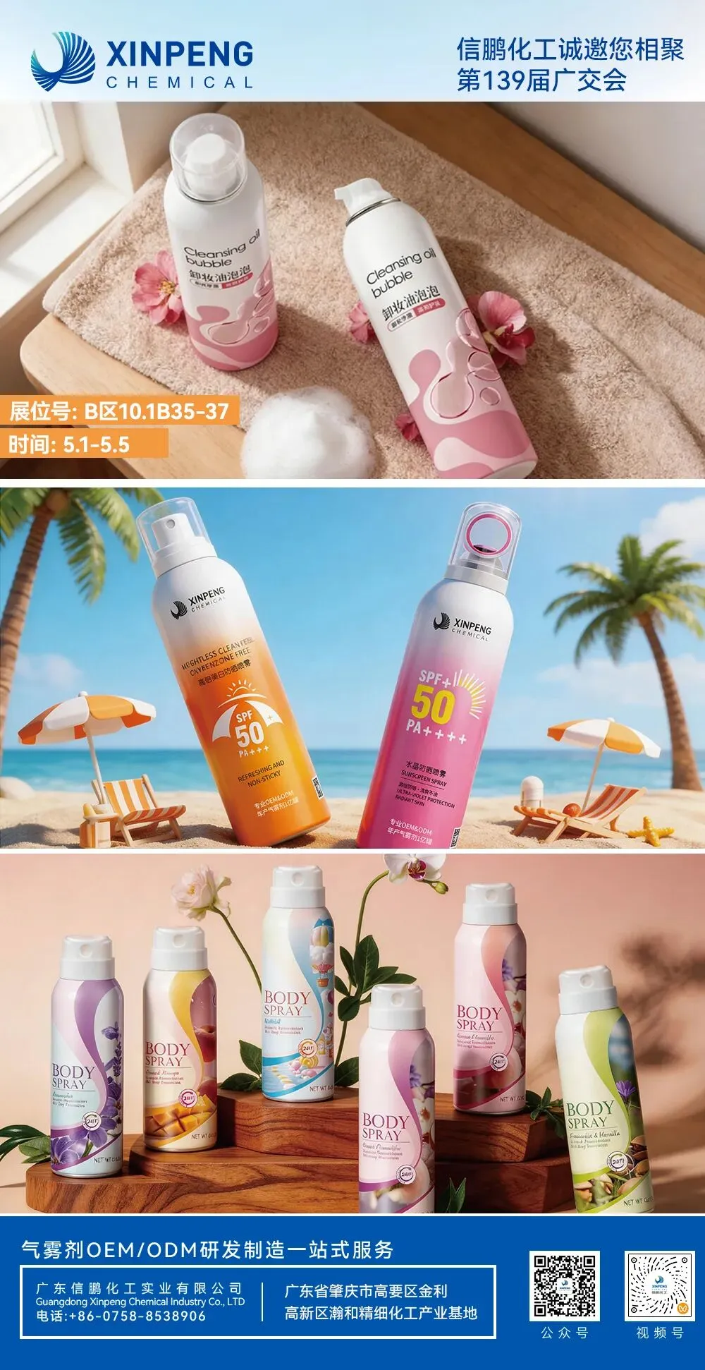 第 139 届中国进出口商品交易会(广交会)盛大启幕,信鹏化工携全线气雾剂产品及 OEM/ODM 定制方案,重磅亮相二期、三期展会,聚焦家居日用、个人护理等热门赛道,与全球客商共赴商贸盛会,共探合作新机遇!