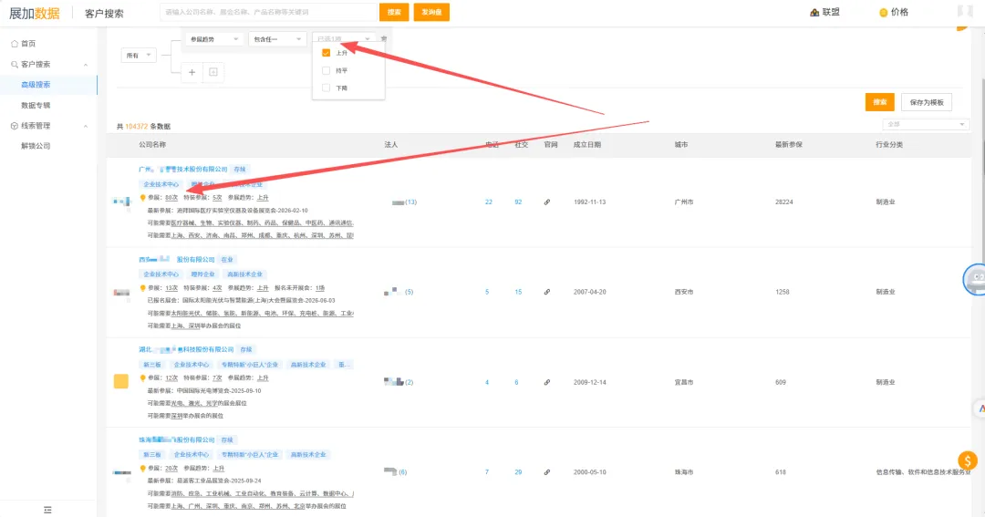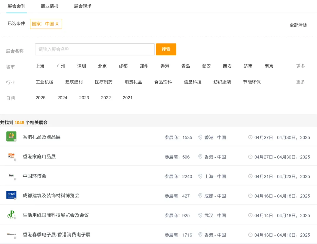 包含展会名称、参展地域、最新参展时间、参展频次、参展趋势等搜索维度。