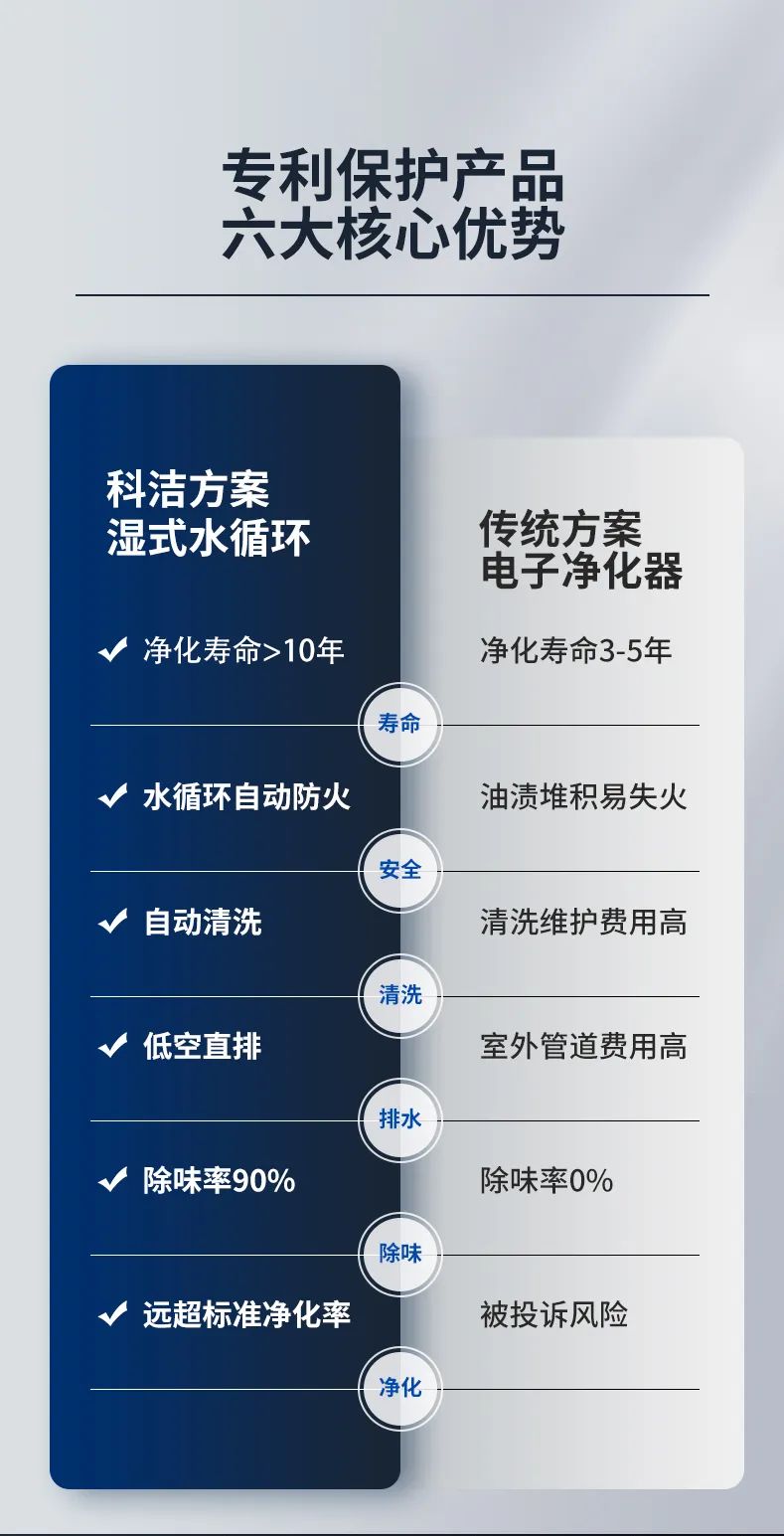 本公司在油烟净化行业深耕30年,拥有多项专利技术,公司于2008年开始攻关湿式油烟净化解决方案,并于当年获得湖北省环保厅的认可,当年发表湿式油烟净化解决方案实用新型专利2篇。研发过程中,公司协同华中科技大学机械学院、材料学院攻关湿式净化器自动排油和除味难题,开发科洁新一代湿式油烟净化解决方案,开发三大系列产品,分别为科洁新型湿式油烟净化一体机、科洁新型湿式油烟净化器和普通前置物理净化一体机。三大系列产品上市几年来,获得无油烟扰民、无居民投诉的优秀业绩,获得了商圈、大型酒店、机关食堂和学校食堂的广泛认可,并且2023年开始与城管部门合作,推荐商户安装并发放补贴的标杆产品,为居民免于油烟困扰保驾护航。