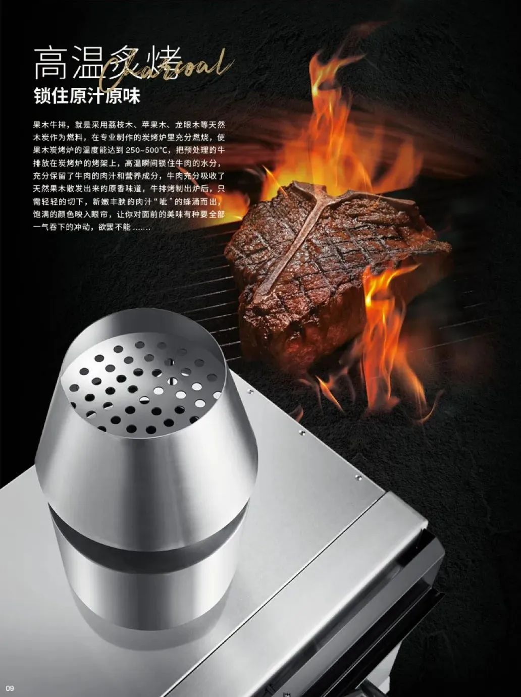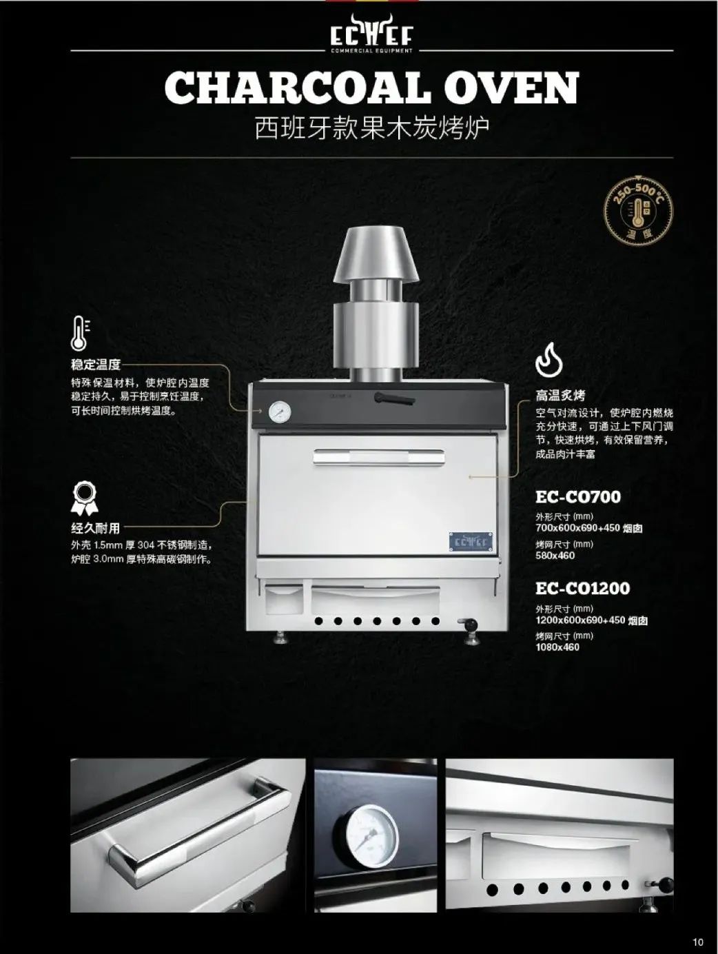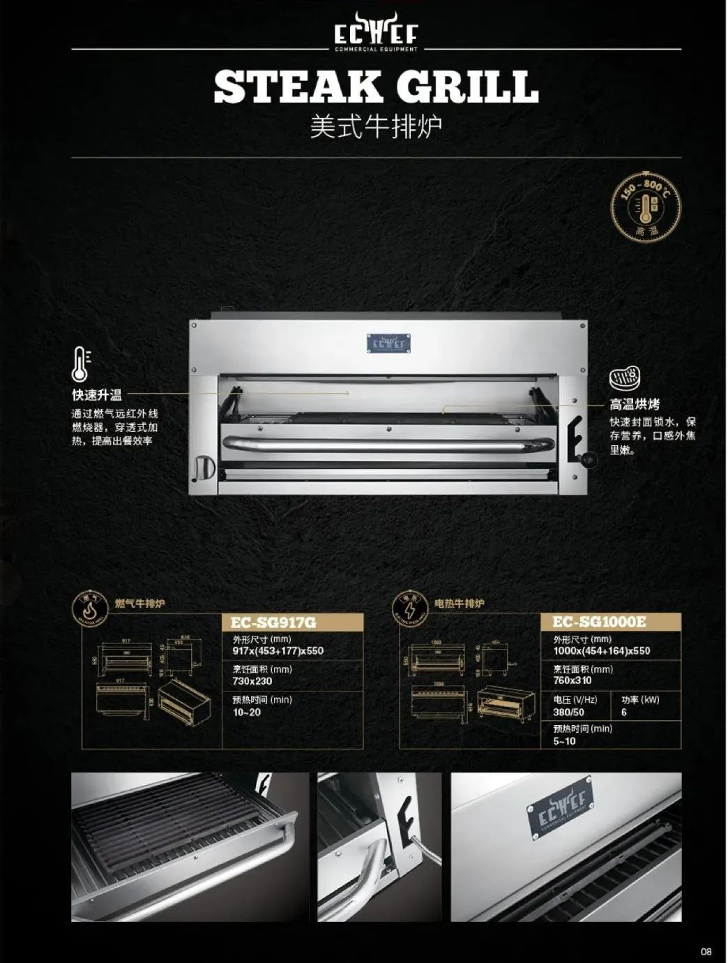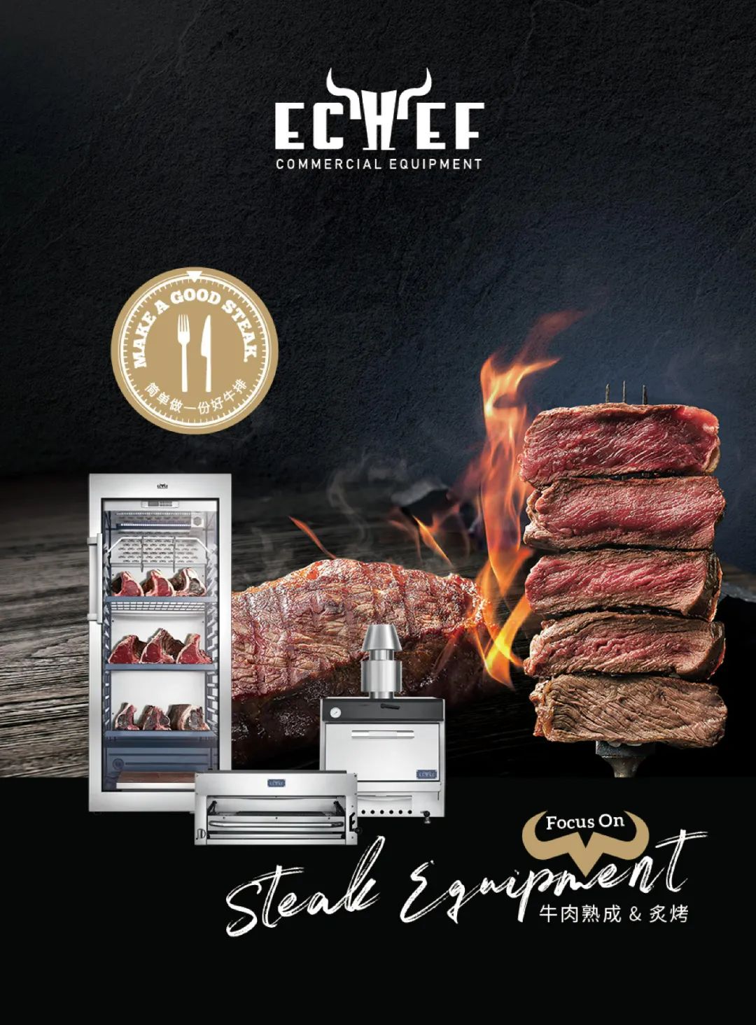 本公司ECHEF品牌的诞生是为了能让厨师能简单地做出一份好牛排,同时满足国内外西餐对专业牛排设备的需求,ECHEF品牌产品包括牛排的储存,加工以及烹饪,每个环节都非常重要,设备包括:风冷厨房冷柜,急速冷冻柜、干式牛肉熟成柜、低温慢煮机、高温牛排烤炉,其中烹饪设备作为最后一道工序,至关重要,高温牛排烤炉分为三大系列,电加热系列(200 °C ~500 °C)、燃气系列(300°C ~800 °C)和果木炭烤系列(250°C ~500 °C),能满足和覆盖所有应用场景,并能满足不同品种肉类和部位的烹饪要求,帮助餐厅提高附加值。
