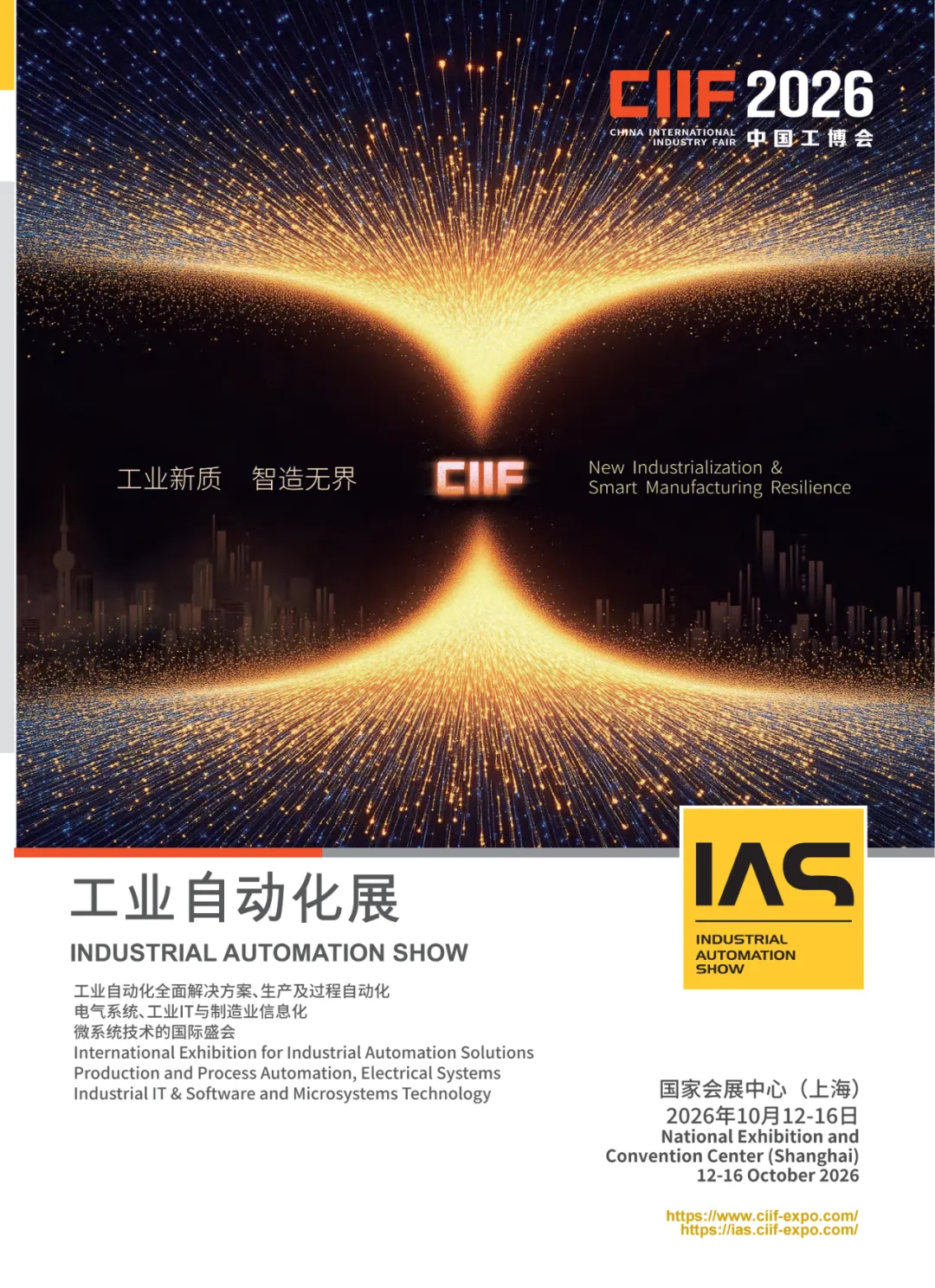 第 26 届中国国际工业博览会工业自动化展(IAS 2026),以自动化 + 工业 AI:工厂的自我进化为主题,将于2026 年 10 月 12 日 - 16 日在国家会展中心(上海)1.1H、5.1H、6.1H 馆盛大启幕。6.5 万㎡展示面积、650 + 全球展商、境外展商占比 60%,打造亚洲规模最大、影响力最强的工业自动化顶级盛会,是全球智能制造技术的 “风向标”。