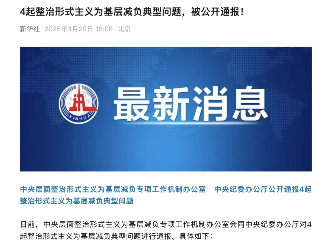 2026年4月20日,新华社微信公众号发布消息,中央层面整治形式主义为基层减负专项工作机制办公室会同中央纪委办公厅对4起整治形式主义为基层减负典型问题进行通报。具体如下: