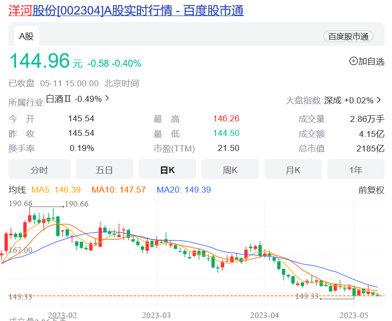 截止2023年5月11日收盘,洋河股份的收盘价为144.96元/股,最新市值2185亿元;山西汾酒的收盘价为236.07元/股,最新市值2880亿元;泸州老窖的收盘价为215.99元/股,最新市值3179亿元。