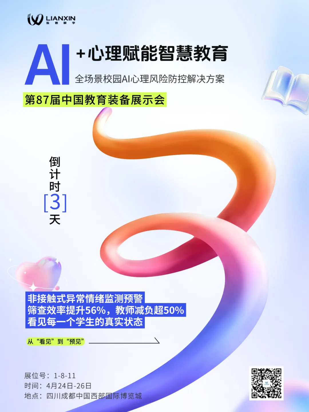 第87届中国教育装备展示会将于4月24日—26日在成都中国西部国际博览城举行。连信将携“AI+心理赋能智慧教育”整体解决方案亮相现场,围绕一个核心问题展开探索:如何更早发现校园心理风险,并实现可持续的预警与干预闭环?