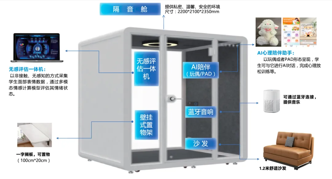 除了核心系统,连信还提供多类AI应用工具。AI魔镜:拍一张照片即可形成多维度心理画像;洞见喵喵:校园AI知心伙伴,学生可自主对话减压;猫头鹰无感评估:15秒视频版大五人格测试,适合大规模初筛;AI心理小屋:私密隔音舱加AI陪伴玩偶,提供放松空间;还可专业定制心理场馆,涵盖咨询室、宣泄室、冥想放松室等。让校园心理安全防控从筛查、评估到干预的每一个环节都有科技支撑。