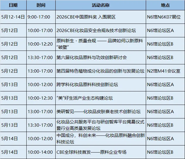 10+原料科技系列活动及2026CBE中国原料奖展区,将围绕功效与技术创新、安评与合规、跨学科科技创新、新原料备案与落地、中国特色植物原料应用等主题的论坛,以及CBE中国原料奖入围展区。