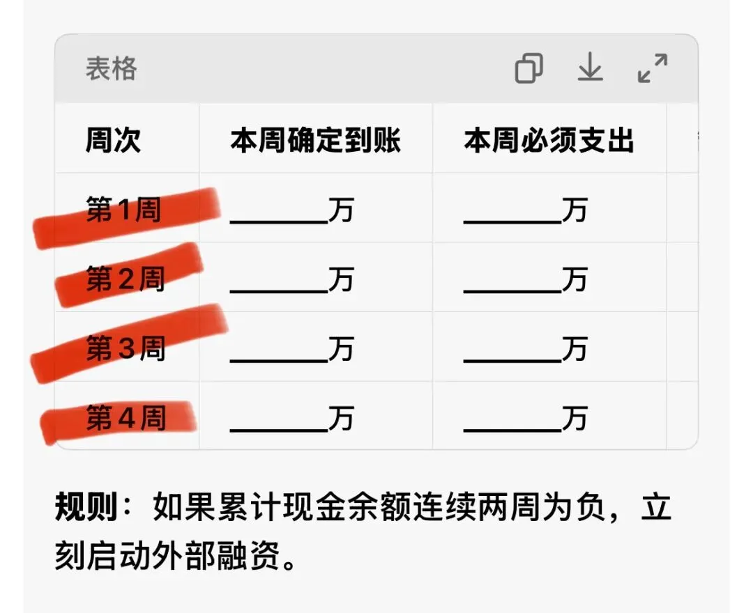 记住规则:连续两周余额为负,马上启动融资规划,别等彻底断了再急。