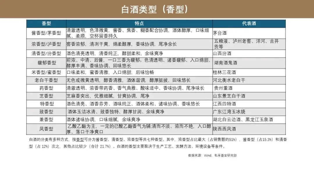 这个是我们看到目前市场上从香型上看能看到的这些品类。虽然香型的品类很多,其实主要的香型还是酱香型、浓香型和清香型这三大品类。这三大品类占白酒的销售:浓香型的占比最大,占整个市场销售额接近一半,占比 51%;酱香型的占比 15.3%;清香型 12%;剩下的其他香型的占比总和大约在 21.7%。这个是从白酒香型的角度我们看到的这些白酒的品类。