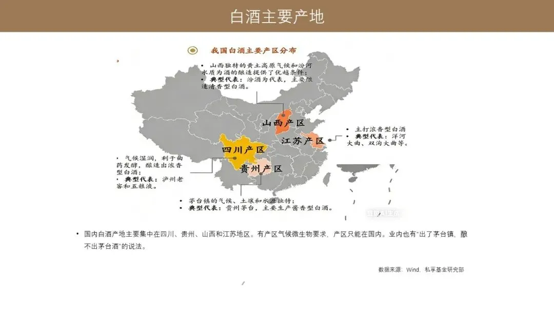 所以国内白酒的主要产地基本上集中在四川、贵州、山西、江苏这几个大的生产地区。当然这里有气候的原因,包括现在业内说的出了茅台镇,酿不出茅台酒,这个应该也是白酒对于环境的苛刻的条件要求。