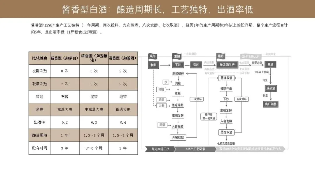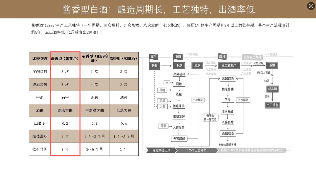 工艺上这些差异,我们也可以看到,其实酱香型白酒的产能,浓香型跟清香型的对比,工艺是最复杂的,提升产能的周期也是最长的,出酒率也是最低的。