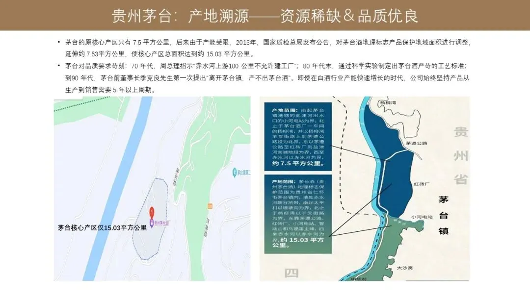 除了工艺上的复杂,茅台酒最核心的应该是从产地的溯源的角度去看,整个贵州茅台的生产被局限在茅台镇。茅台原来的核心产区只有 7.5 平方公里,后来由于产能受限,2013 年国家质检总局发布公告,对茅台酒产地的地理标志产品保护地域面积进行调整,延伸了约 7.53 平方公里,使其核心的厂区总面积达到 15.03 平方公里。整个茅台酒的生产核心产区目前就是这 15.03 平方公里。