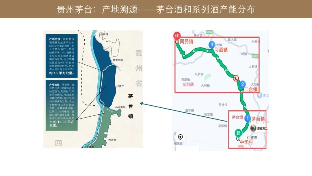 从茅台酒的 15.03 平方公里的核心区来看,茅台酒的生产主要集中在茅台镇。茅台下面的这个系列酒的产能分布主要在茅台镇下游的二合镇、习酒镇、同民镇这些地方。所以我们看到贵州茅台下面,茅台酒的这个主要产区集中在茅台镇,系列酒的主要产区是茅台镇的下游的几个镇,所以茅台酒跟系列酒其实是有明显的区域差异的。