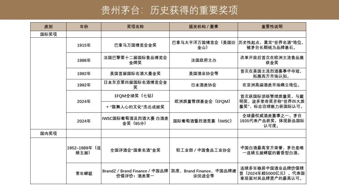 国内的主要奖项,从 1952 年到 1989 年,连续五届全国品酒会国家名酒金奖。目前茅台也常年蝉联中国品牌价值评价酒类第一,也是中国最具价值的消费品牌。
