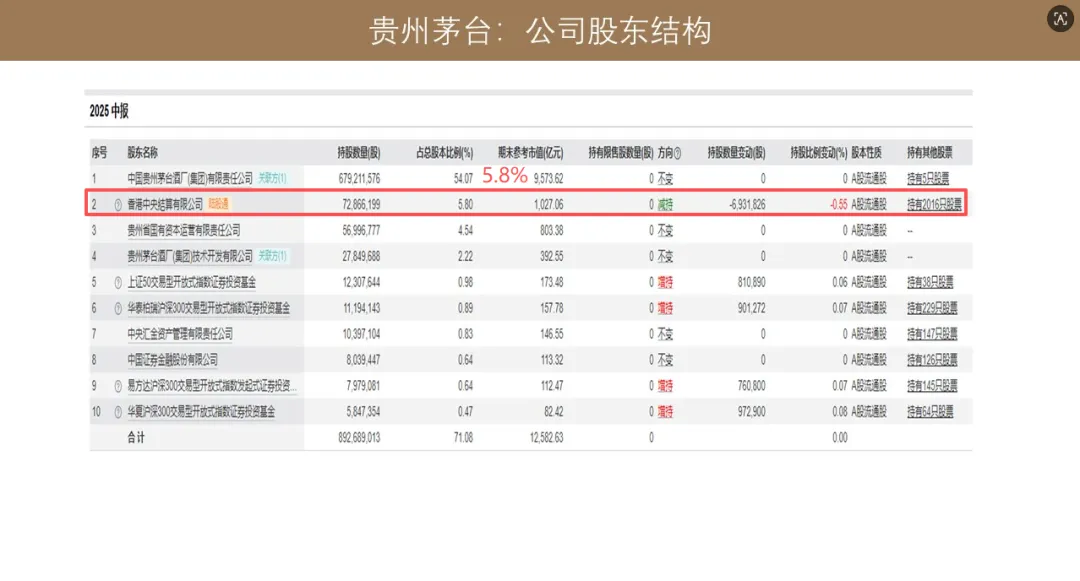茅台前十大股东里面,除了我们刚才看到的这三家贵州省国资之外,我们还看到香港中央结算有限公司通过陆股通持股,占总股本比例 5.8%;还有上证 50 交易型开放式指数证券投资基金、华泰博瑞沪深 300 交易型开放式指数基金、还有易方达沪深 300 交易型开放式指数发起式证券投资基金、以及华夏沪深 300 开放式指数证券投资基金,这几只应该也是国内目前规模最大、极具代表性的沪深 300 和上证 50 指数基金。前十大股东里面还有中央汇金资产管理有限公司、中国证券金融股份有限公司,这些是前十大股东的情况。