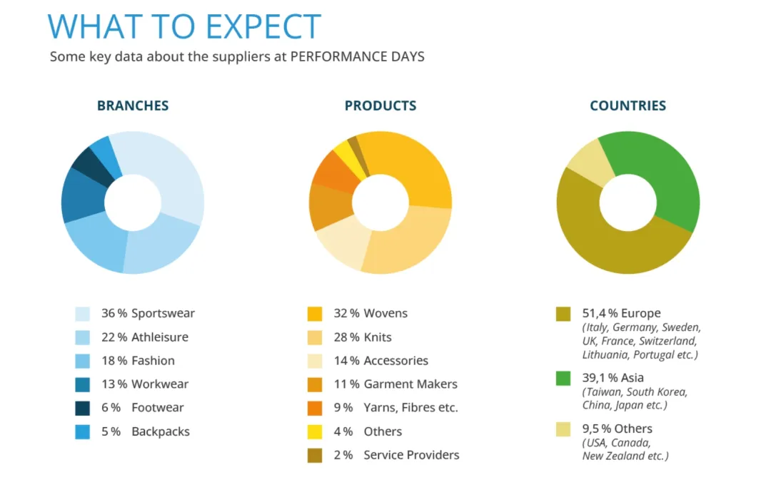 PERFORMANCE DAYS每届有来自38多个国家的584家主要国际制造商齐聚一堂,展示他们的服装系列材料。亲自与供应商会面,感受面料和配饰,并亲自观看产品演示。与制造商一对一交流,开始或续签业务关系。