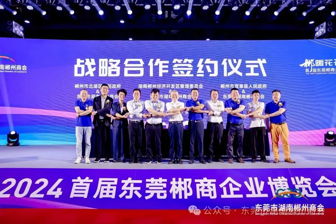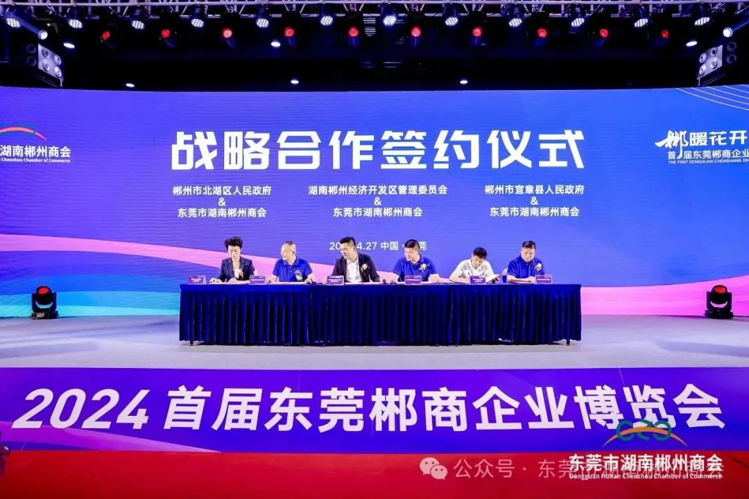 湖南郴州经济开发区管理委员会,郴州市北湖区人民政府,郴州市宜章县人民政府共同和东莞市湖南郴州商会签订战略合作协议。