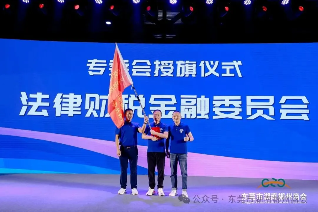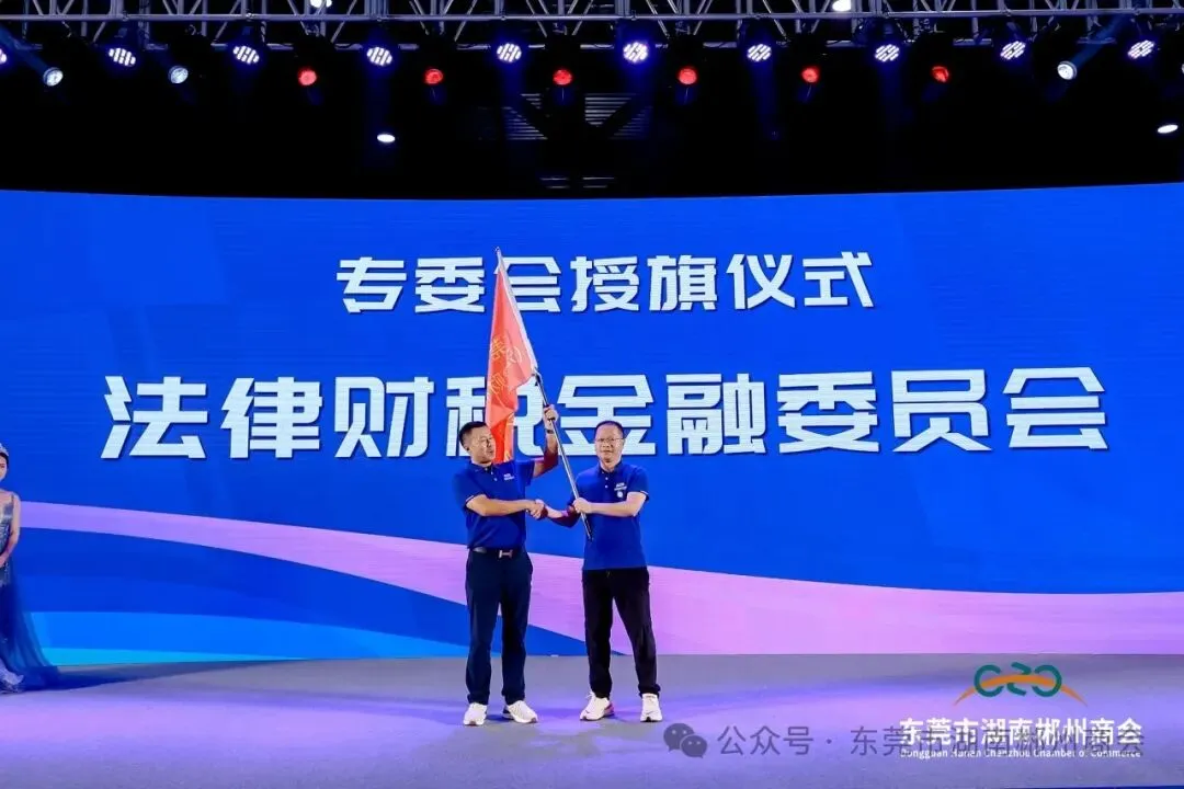 会长陈克将法律财税金融委员会旗授予法律财税金融委员会主任王世周王律师。