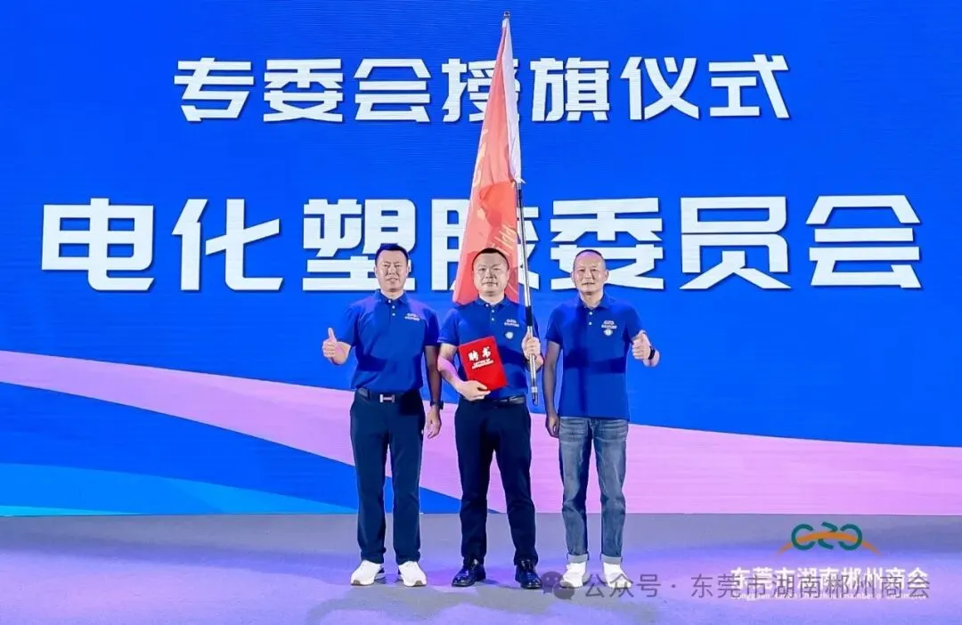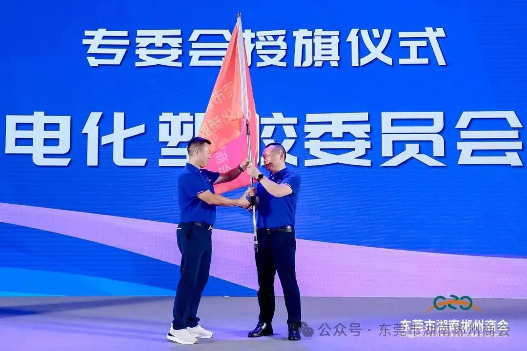 会长陈克将电化塑胶委员会旗授予电化塑胶委员会主任郭志刚郭总。