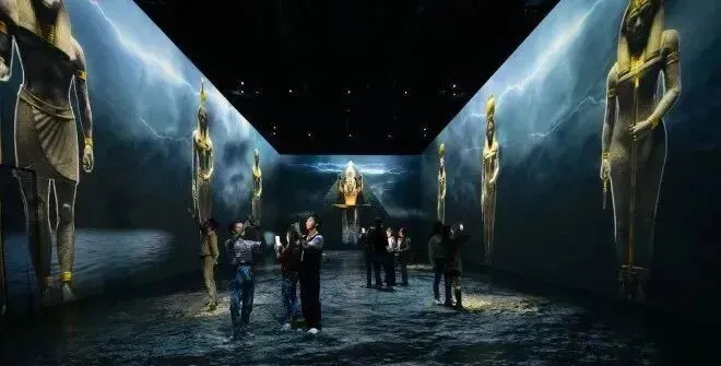 占地1,200平方米的投影式沉浸区域,迎请游客与古埃及的法老图坦卡蒙一同踏上一段神秘文明的历史之旅。在这神奇的时光里,汲取丰富的文化元素,它像覆盖在沙漠中的沙粒,以及被尼罗河之水所稀释的谜团,持续着吸引着我们。