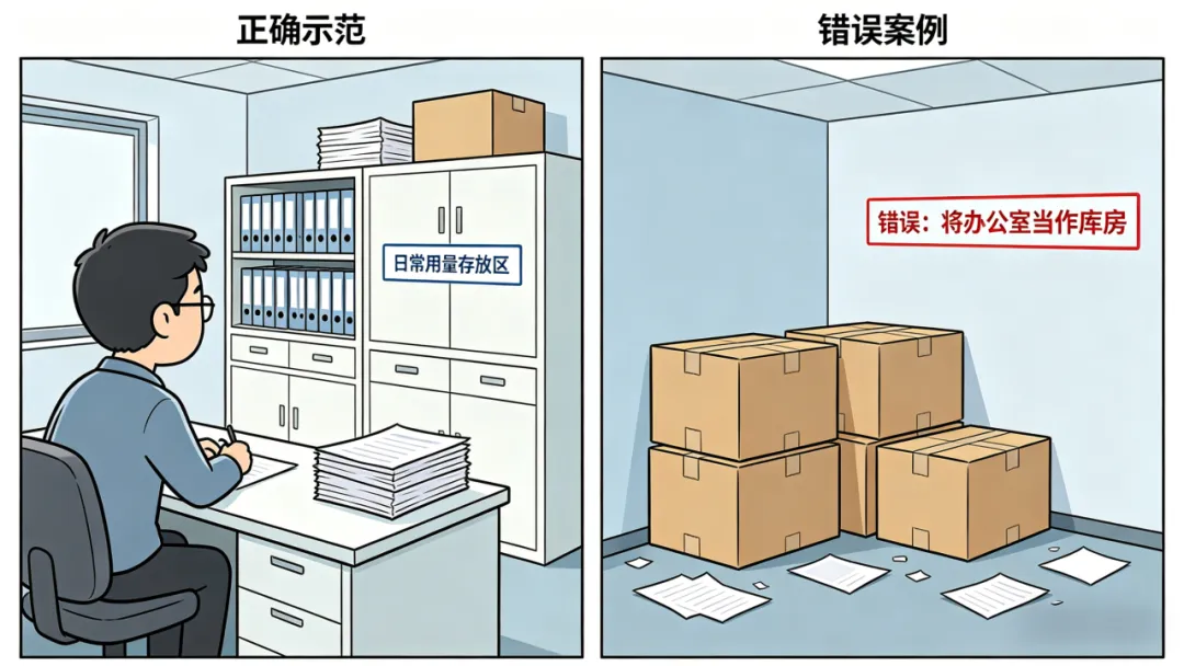 易燃品仅存放日常用量,不将办公室当库房