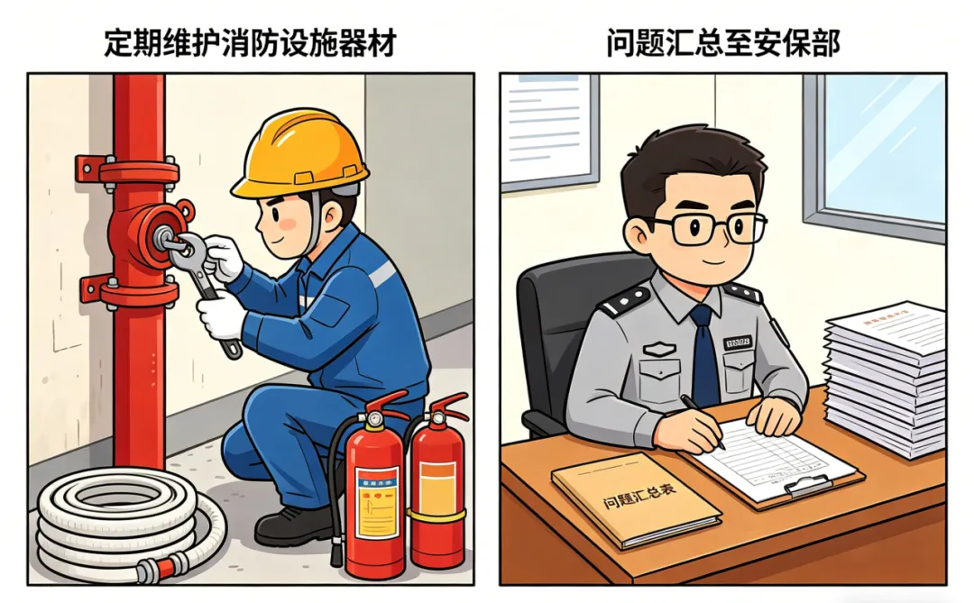 定期维护消防设施器材,问题汇总至安保部
