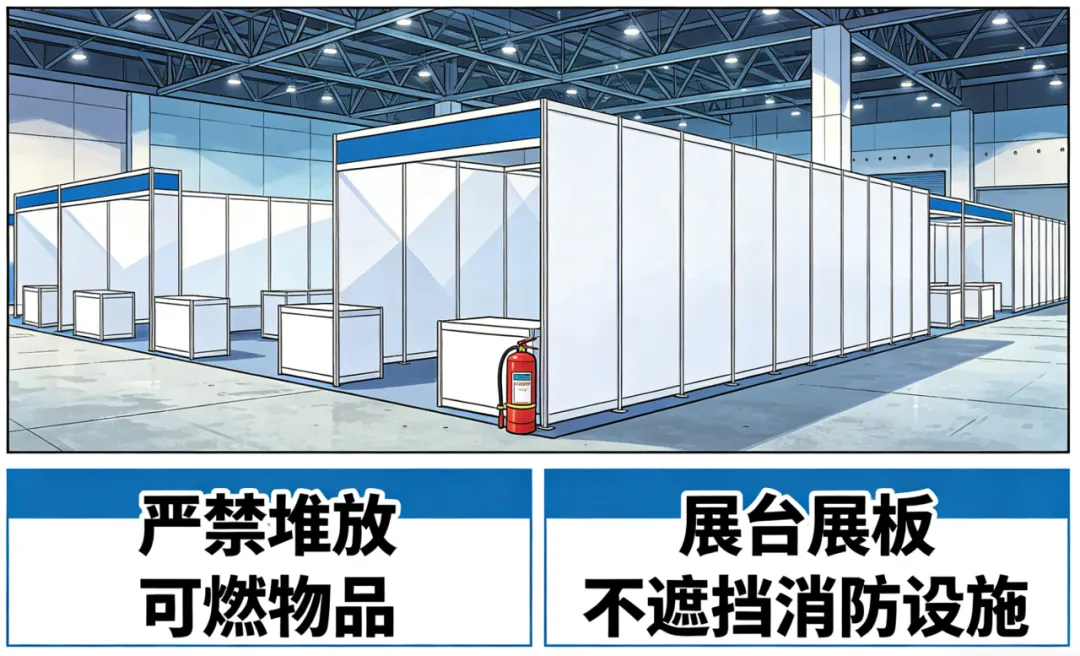 严禁堆放可燃物品,展台展板不遮挡消防设施