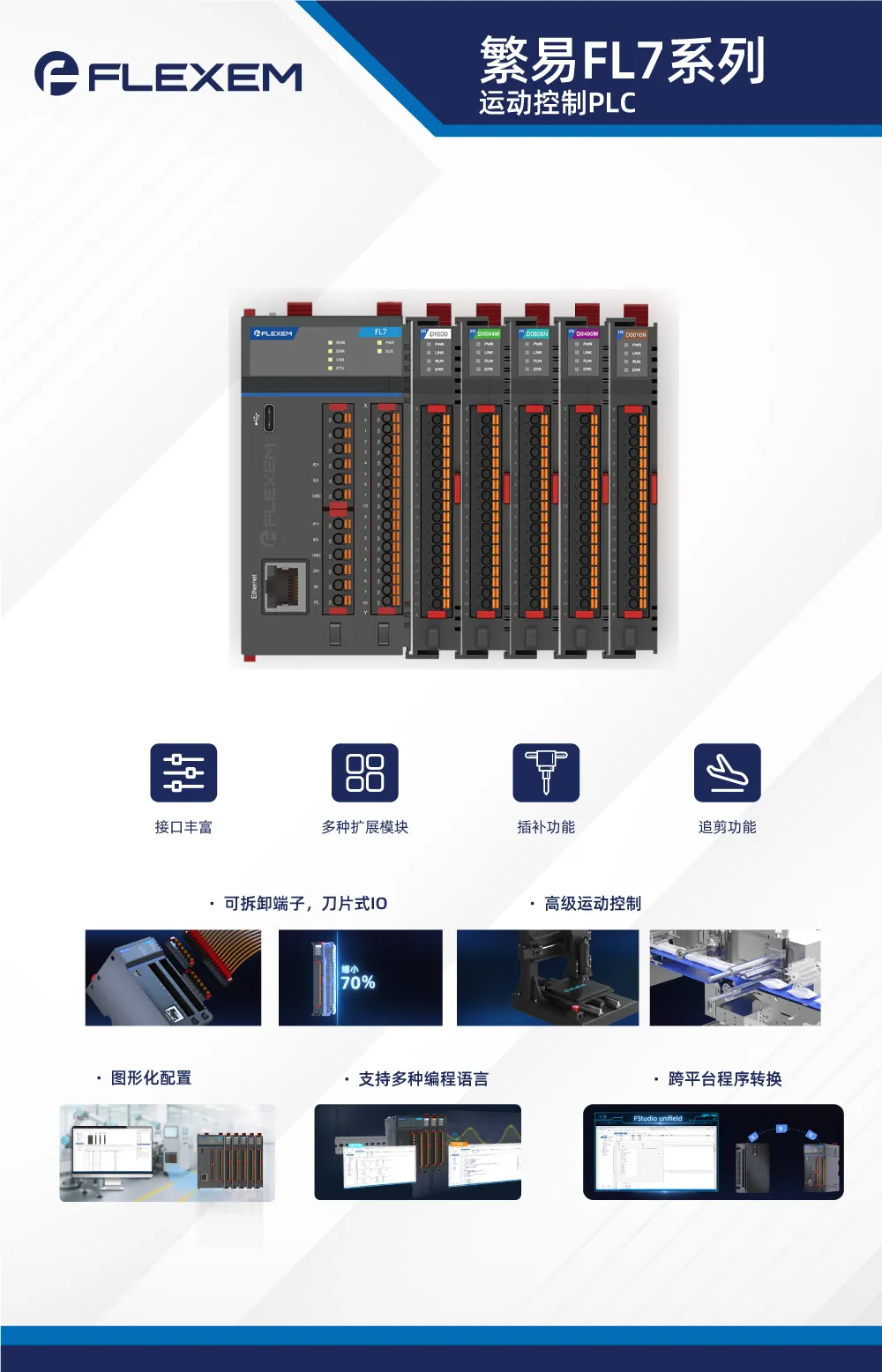 FL7系列运动控制PLC支持梯形图与ST结构文本等多种编程语言,提供跨平台程序转换功能,可平滑迁移工程项目并兼容多品牌PLC程序,极大提升开发效率与应用灵活性。采用纤薄的刀片式IO设计,大幅节省电柜空间;配备可拆卸端子,维护无需拆线,狭小空间也能轻松应对。