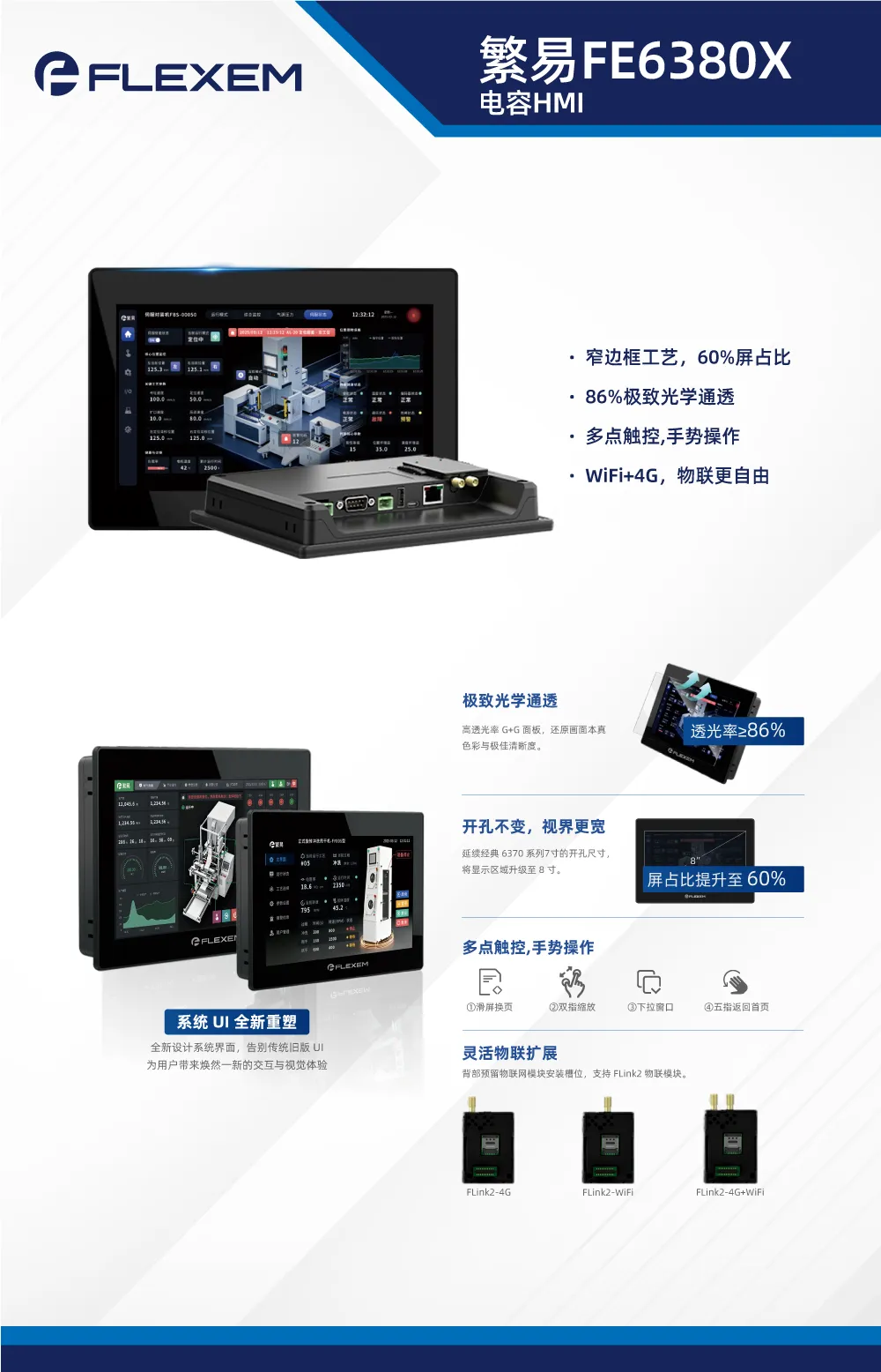 FE6380X 8英寸电容屏HMI基于畅销系列FE6370全新升级,在完整延续7英寸开孔尺寸的基础上,利用窄边框工艺将显示面积提升至8英寸,用户无需改动控制柜开孔即可获得约15%的可视面积增量。工业级G+G投射式多点电容屏,支持滑屏、缩放等流畅手势,具备86%以上高透光率与6H表面硬度;内置工业级压采样技术,从源头增强触摸信号信噪比,确保精准、灵敏的交互体验。