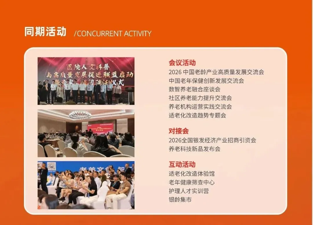 展会同期将举办河北老龄产业高质量发展交流会、中国老年保健创新发展交流会、数智养老融合座谈会、京津冀医养结合发展论坛等多场高端论坛;举办全国银发经济产业招商引资会暨重点项目签约、养老科技新品发布、跨境老龄发展交流等对接活动;设置适老化改造体验馆、老年健康筛查中心、护理人才实训营、银龄集市等互动体验场景,实现 “展、论、洽、训、体验” 五位一体高效联动。