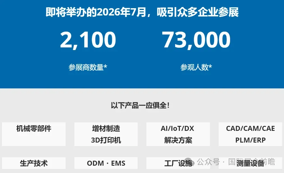 东京工业展-亚洲领先的制造业贸易展2026 年的下一届展会预计将有 2 100 家参展商,吸引 73 000 名参观者!* 东京工业展由 10 个专业展组成,重点展示面向制造商的数字化转型服务、工厂自动化、增材制造、各种机械零部件、测量产品和其他工厂设备。主要观众来自全球汽车、重工业、电气、机械和精密设备制造商的设计、开发、生产工程、采购和信息系统部门。