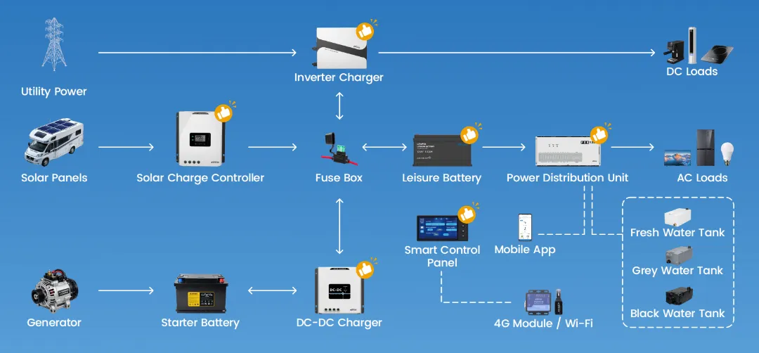 所有产品深度适配房车电气架构,实现行车、市电、太阳能等多源自动管理,真正“一屏掌控全车电力”。配合Solar Guardian智能监控平台,用户可随时掌握系统状态,进行远程管理。